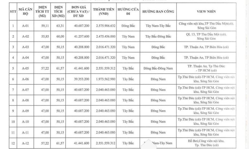 Ngoài bảng giá này khách hàng có thể mua hàng chuyển nhượng lại với giá thấp hơn LH : 0918.90.93.94 ( Ban QL Dự Án )