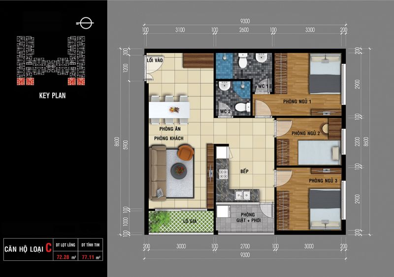 Căn hộ 3 phòng ngủ (77 m²): Từ 2 tỷ 9 tỷ/căn.