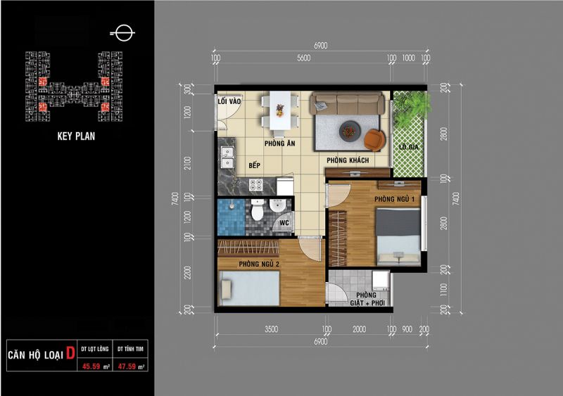 Căn hộ 2 phòng ngủ: Phù hợp gia đình trẻ, diện tích 47–62 m².