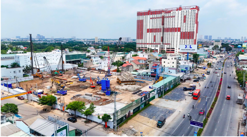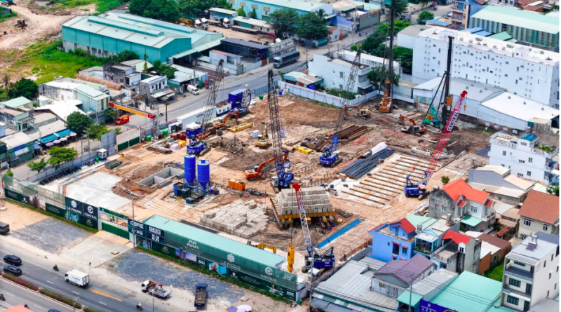 Tại công trường, dự án đang được triển khai theo hướng đồng bộ và bài bản, với mặt bằng đã hoàn thiện các bước chuẩn bị như quây tôn, san lấp và tổ chức phân khu thi công rõ ràng. Hệ thống máy móc như máy khoan cọc nhồi, máy ép cọc cùng phương tiện vận chuyển vật liệu được huy động liên tục, cho thấy sự tập trung vào chất lượng nền móng và kiểm soát kết cấu ngay từ giai đoạn đầu.